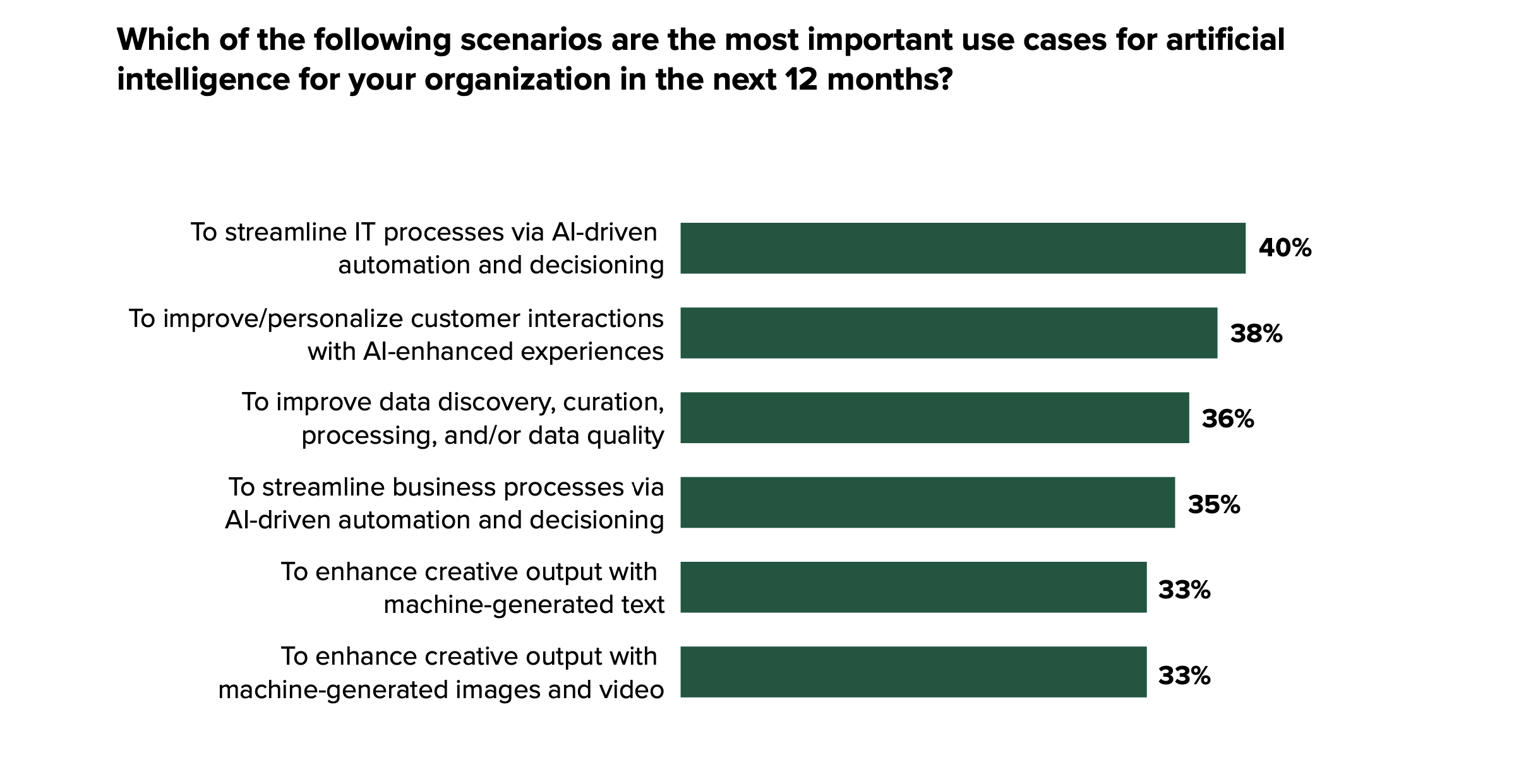 We recently conducted a comprehensive survey of 543 small to medium-sized businesses. The survey participants were individuals in senior management roles with decision-making or influencing capabilities. During the survey, we asked the following critical question: "Which of the following scenarios do you believe are the most crucial use cases for artificial intelligence in the coming 12 months?”